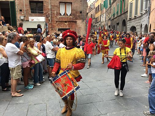 Raggiungiamo una strada che si trova nel territorio della Contrada dell'Onda. Siamo vicinissimi a Piazza del Campo e da lì, dice il mio amico, riusciamo a vedere bene il corteo storico che ormai si è riunito: tutti i figuranti delle 17 Contrade (partecipano al corteo anche le sette che non corrono il Palio).