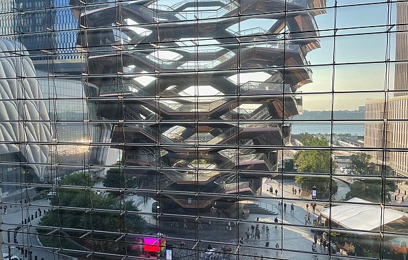 Largo 15 metri alla base per 46 metri di altezza, il Vessel ricorda vagamente un alveare. E’ formato da 154 rampe che intersecano 80 terrazze, affastellate su 16 piani. In tutto, 2.500 scalini. I pezzi sono stati fabbricati e assemblati in Italia, a Monfalcone, e trasportati a New York via nave. Un’opera faraonica, voluta dai committenti degli Hudson Yards per completare la piazza pubblica centrale con una scultura interattiva dalla forma sensazionale. Il progettista, Thomas Heatherwick, concretizzó le loro aspettative ideando un agglomerato di ferro, bronzo e cemento su cui i cittadini si potessero arrampicare, per sperimentare l'emozione dell'ascesa e osservare la città e il fiume da una prospettiva insolita.