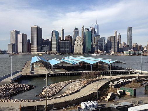 Mi ha colpito un affaccio da Brooklyn, vicino al ponte di fronte al ricchissimo sfondo dei grattacieli di Wall Street e dell'alta finanza. Di fronte lo spettacolare slyline dove tra poco spunteranno altre torri alte e lucide. In primo piano, altra sponda dell’East River, delle strutture sportive, campi di basket, calcetto, volley, forse di bocce e squash coperte da tettoie azzurre. Roba semplice, di base, a disposizione di tutti, che sembra quasi misera rispetto a quello che si vede poche centinaia di metri più in là.