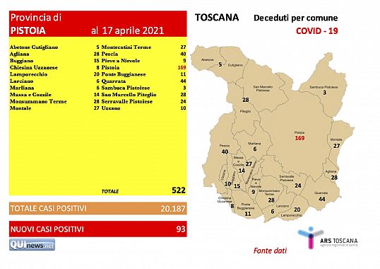 Questa la distribuzione dei nuovi casi mappata dall'Asl centro: Abetone Cutigliano 1, Agliana 7, Buggiano 4, Chiesina Uzzanese 1, Lamporecchio 7, Larciano 4, Monsummano Terme 17, Montecatini Terme 7, Montale 3, Pescia 5, Pieve a Nievole 1, Pistoia 19, Ponte Buggianese 4, Quarrata 8, Sambuca Pistoiese 1, Uzzano 4.