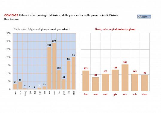 96 invece, le positività accertate nelle ultime 24 ore nel territorio Pistoiese dove, da inizio emergenza, il virus ha contagiato complessivamente 18170 persone. Le vittime finora registrate sono 451.
