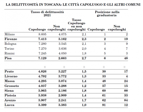 Sono tre le province toscane che si classificano fra le prime 25 in Italia per incidenza di delittuosità: si tratta di Firenze (7a con un tasso di 4.719), Prato (8a con 4.403) e Livorno (9a con 4.257).