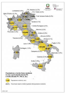 Ispra ha individuato come complessivamente il 93,9% dei comuni italiani (7.423) sia a rischio per frane, alluvioni e/o erosione costiera, con 1,3 milioni di abitanti a rischio frane (13% giovani con età < 15 anni, 64% adulti tra 15e 64 anni e 23% anziani con età > 64 anni) e 6,8 milioni di abitanti a rischio alluvioni.
